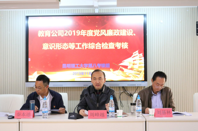 为贯彻落实党的十九大关于全面从严治党的战略部署,增强“四个意识”、坚定“四个自信”、做到“两个维护,按照昆明理工大学《关于对2019年度贯彻落实党风廉政建设责任制、意识形态工作责任制进行综合检查的通知》的部署,2019年11月21日10时,第八检查考核组在周峰越副校长的带领下对教育公司党风廉政建设和意识形态工作进行综合检查考核,教育公司干部职工共50余人参加。